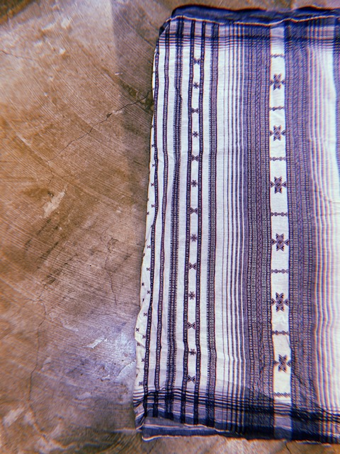 7〜8mくらいの長さの布でして、本来は身体に巻き付けて女性がドレスのように着用します。金糸刺繍が入ったものを見かけることが多いですが、今回のものは刺繍がないものを意図的に選んでいます。白と生成りの中間色をベースにインディゴカラーの織柄が入ります。