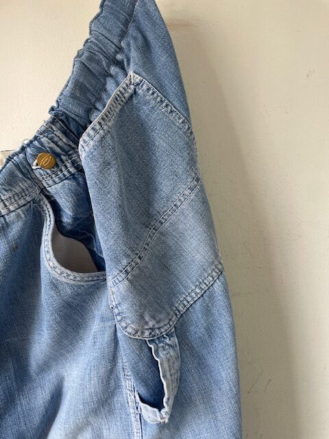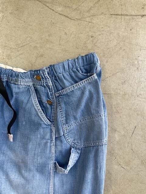 ご存知の通りオーバーオールは元々フロントのトップボタンがなく、ベルトループもありません。