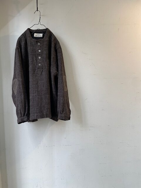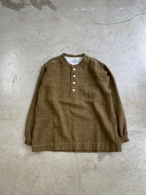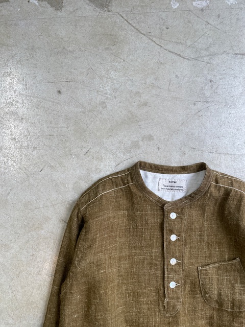 形は開きが深めの4つボタンのヘンリーネックタイプのシャツ。