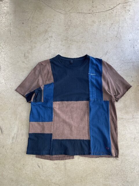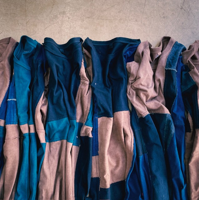ベースの色が泥、藍福木、本藍、インド藍、藍福木+インド藍の5種類の天然染色で染めたものを使用しており、それぞれの存在感が凄い。