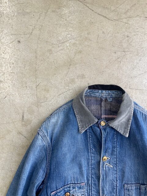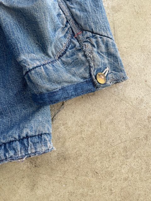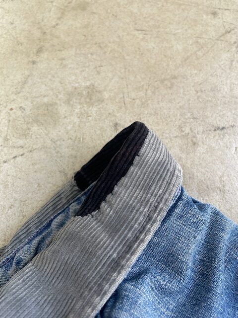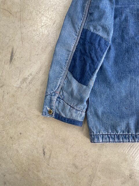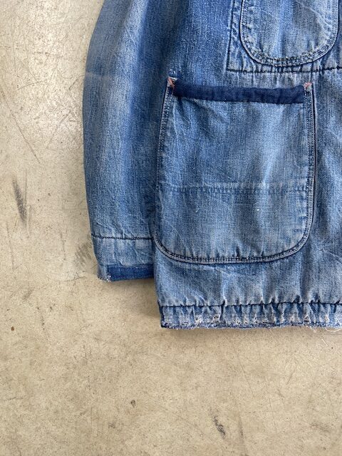 全体的にいい感じにフェードしていますが、衿、左肘、袖口、ポケット口にダメージがあったのでミシンとハンドでリペアしてあります。